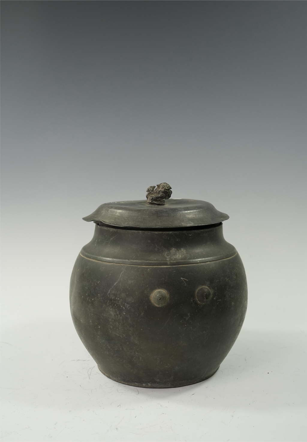 锡制圆鼓腹兽钮盖罐