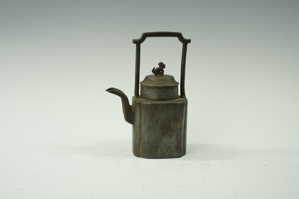 锡制方型兽钮官帽提梁壶