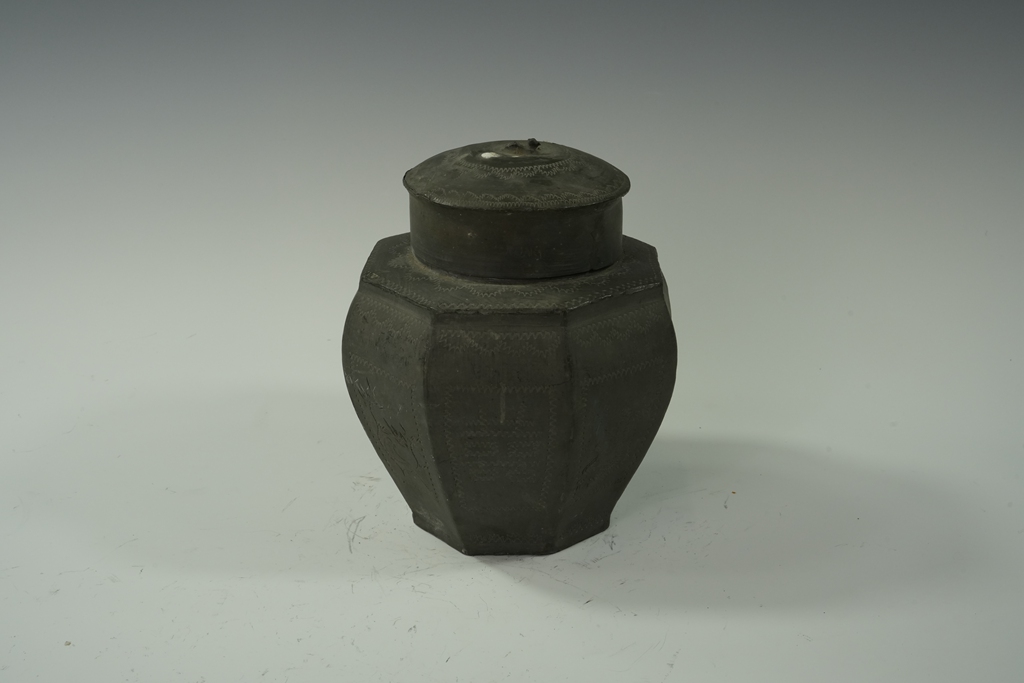 锡制八棱鼓腹刻花兽钮盖罐
