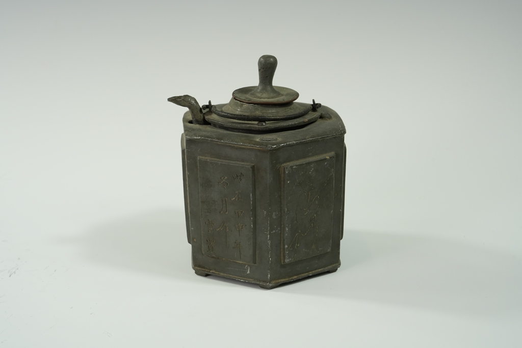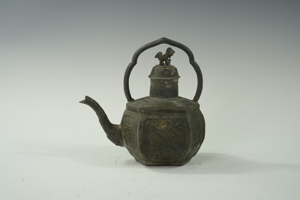 锡制六棱鼓腹动物纹兽钮提梁壶