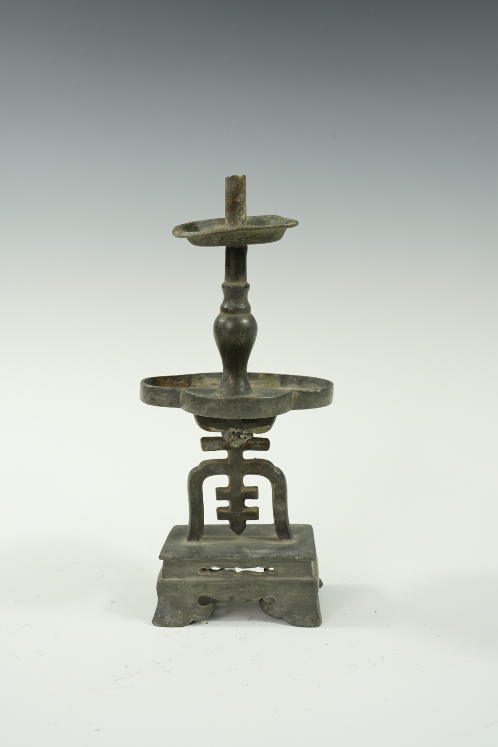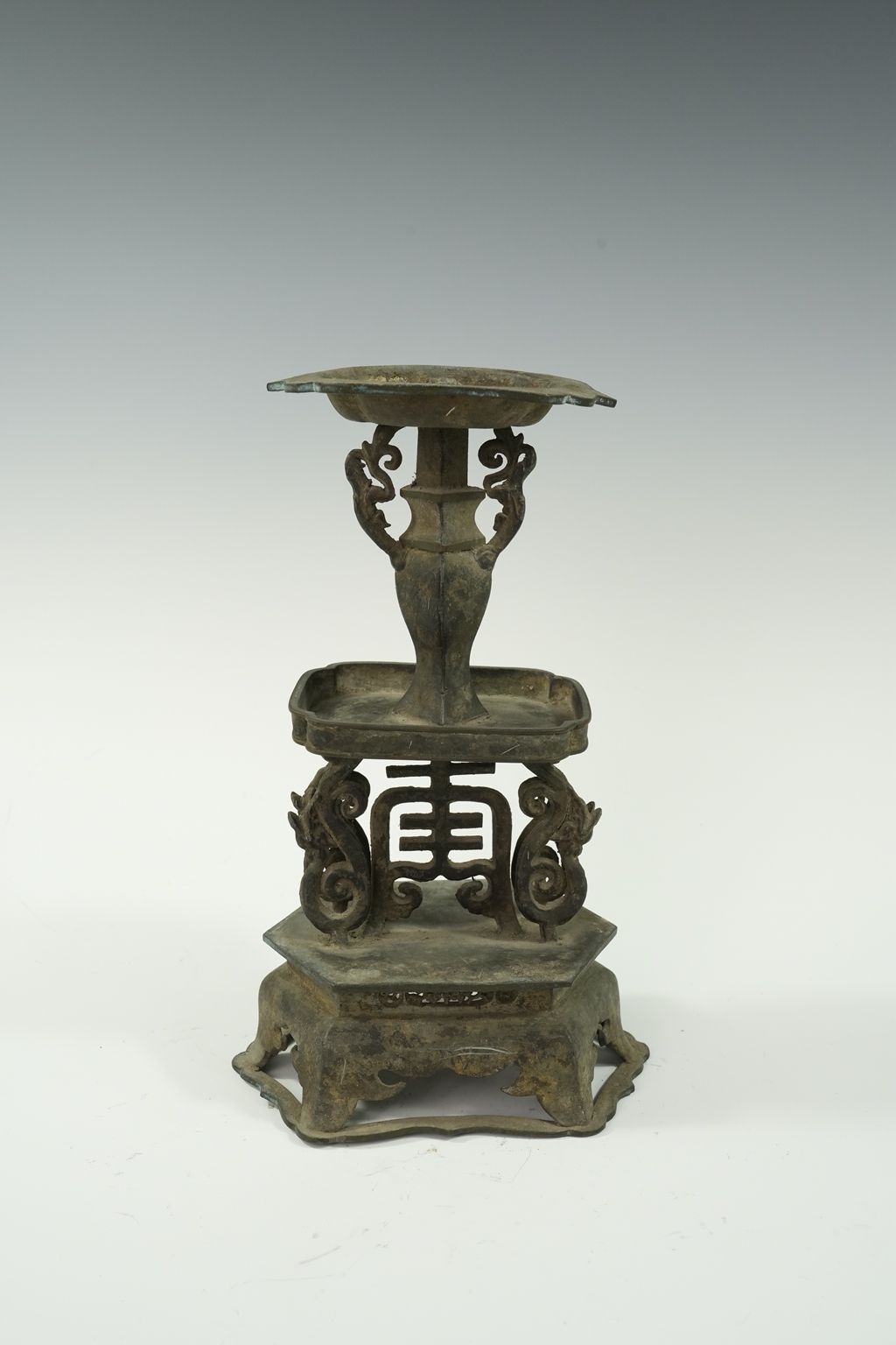 锡制方底寿字镂雕圆托双层烛台