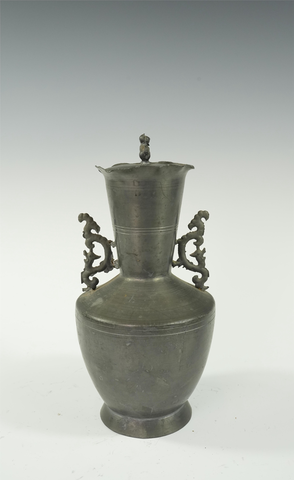 锡制双耳长颈带盖瓶
