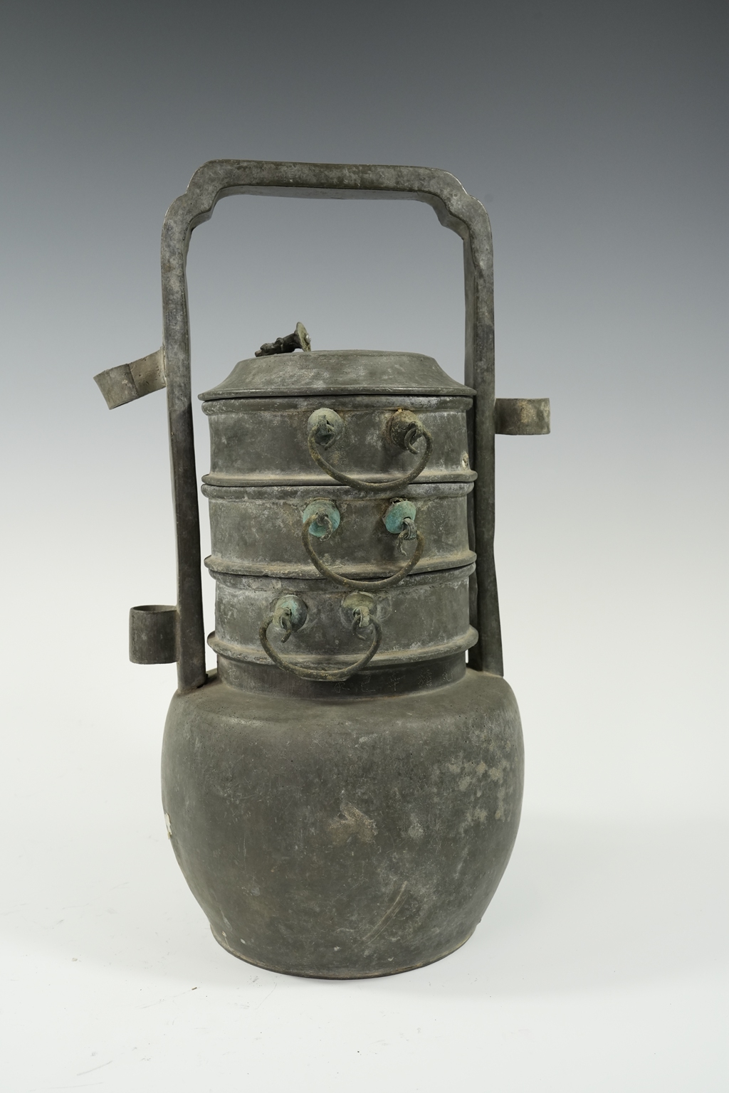 锡制圆鼓腹直颈三层提梁食盒